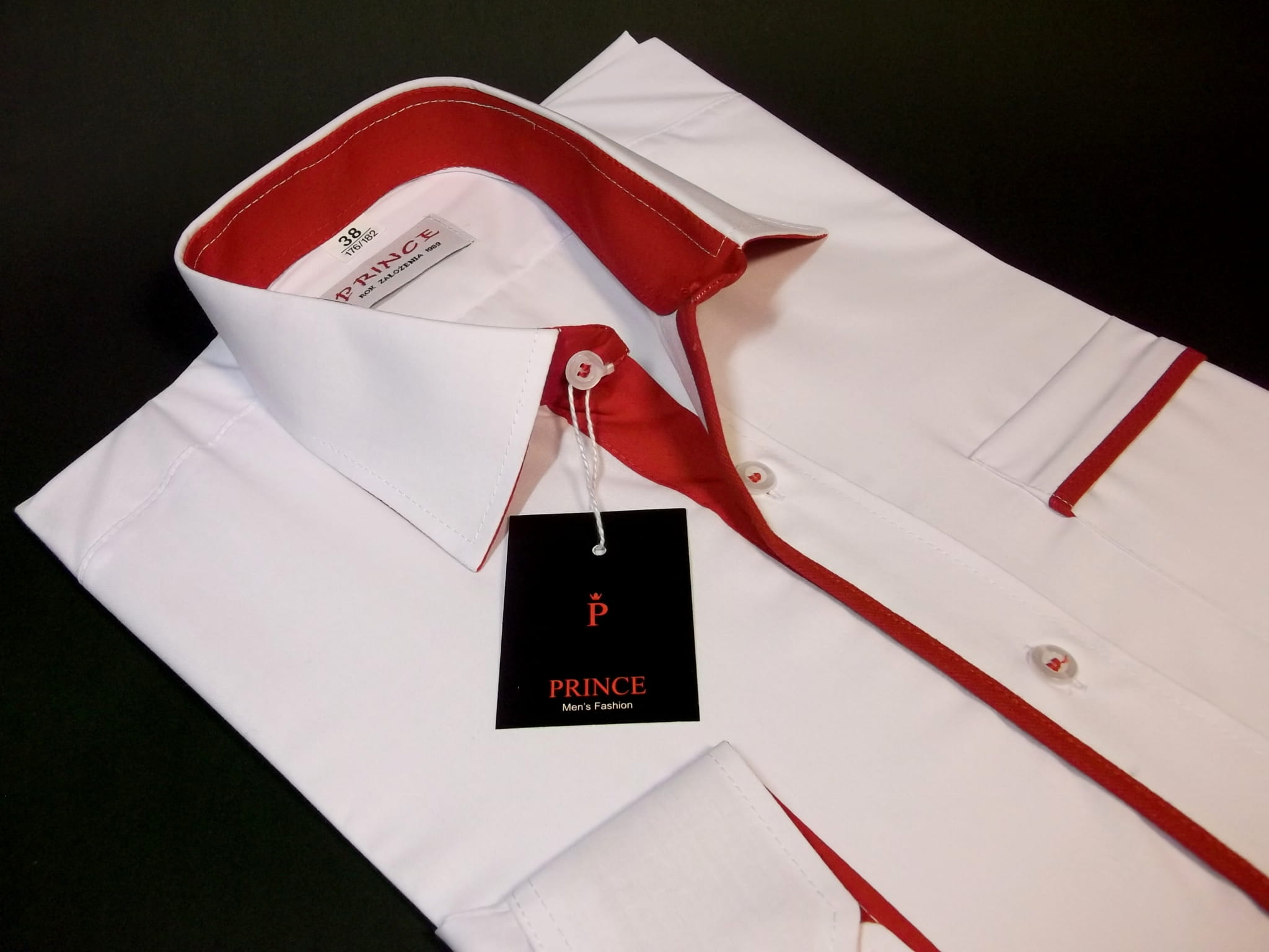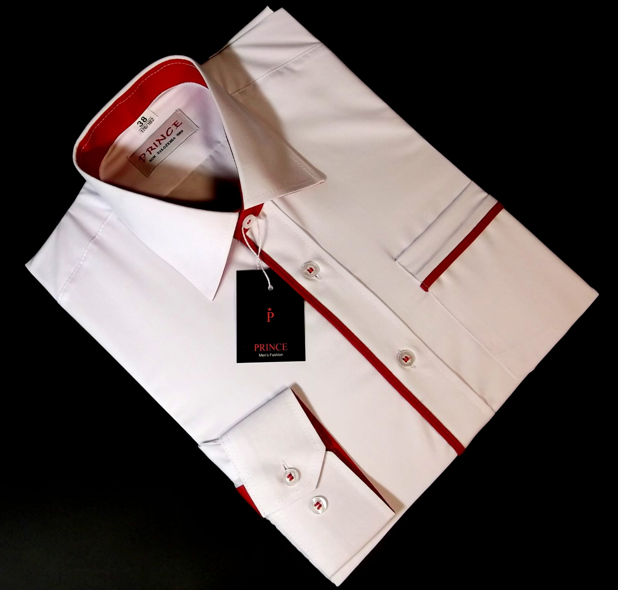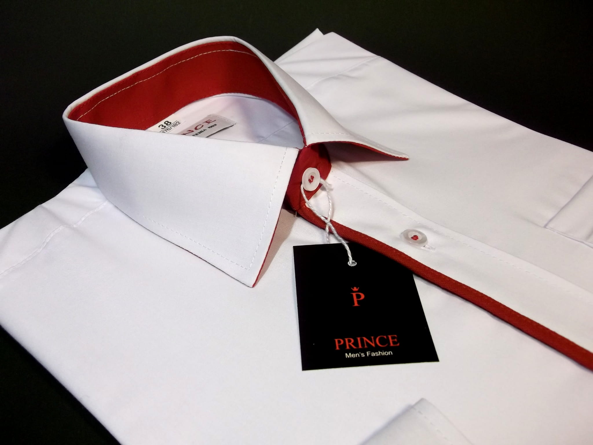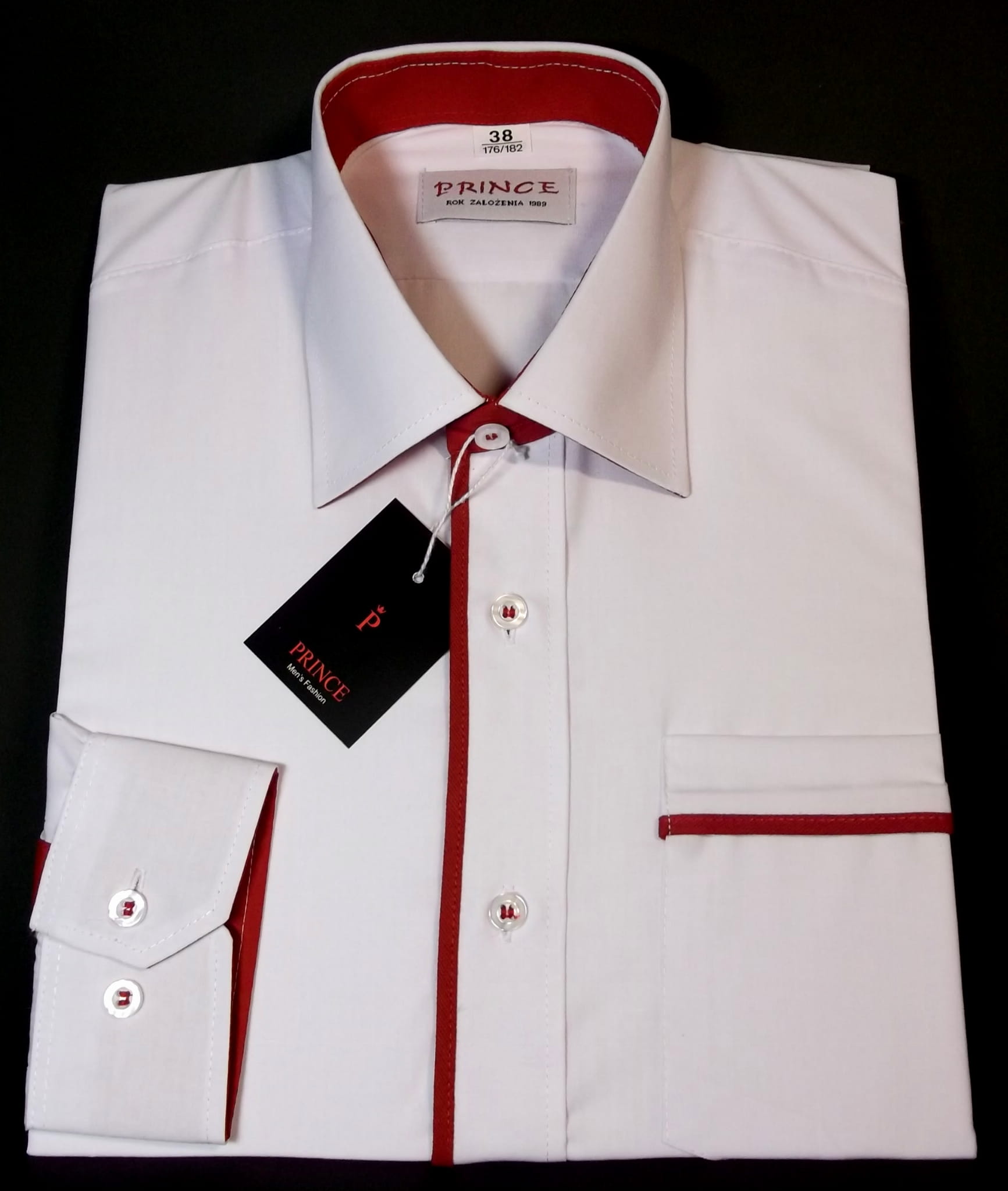 Koszula męska biała gładka z czerwonymi lamówkami.
