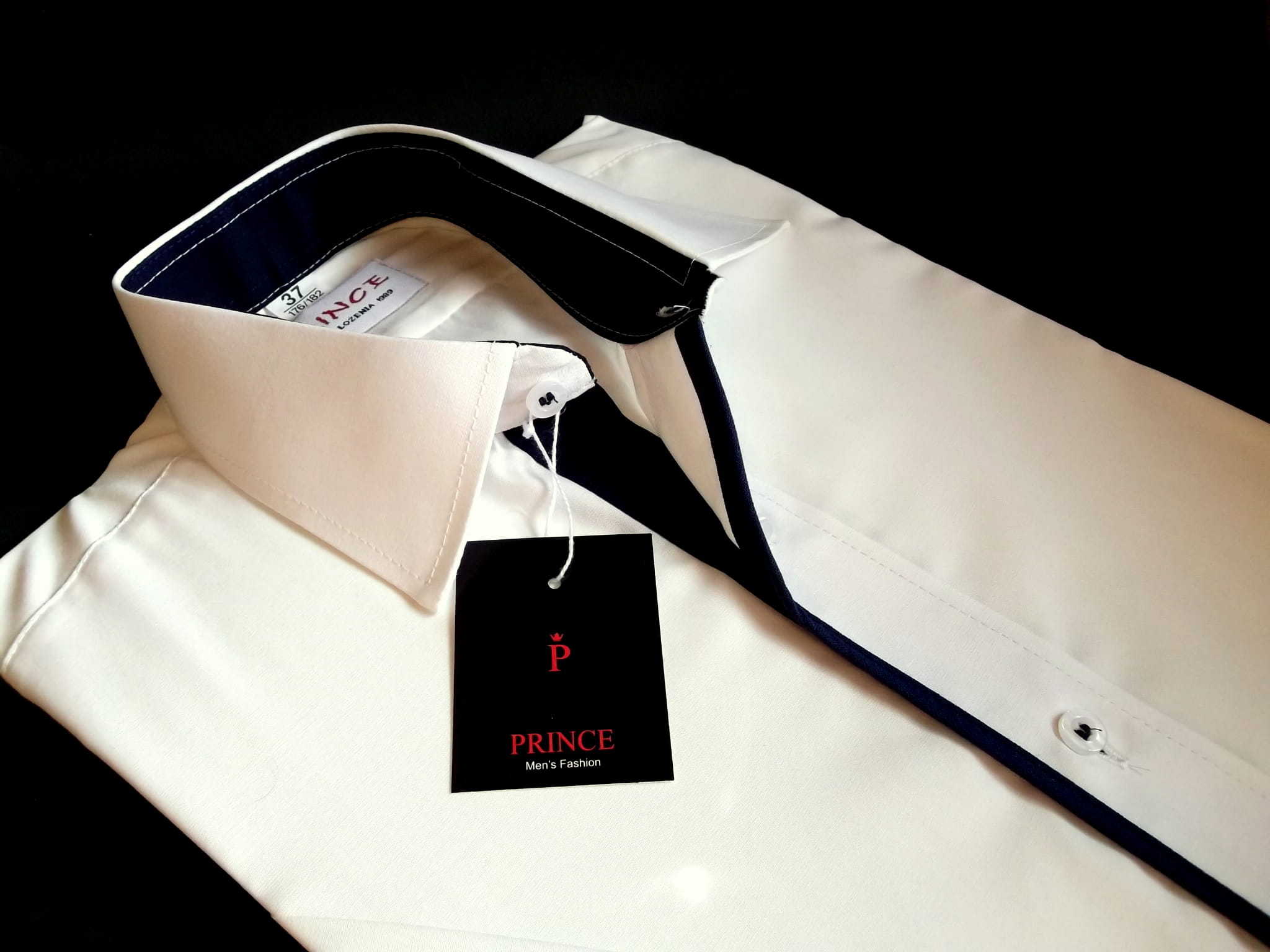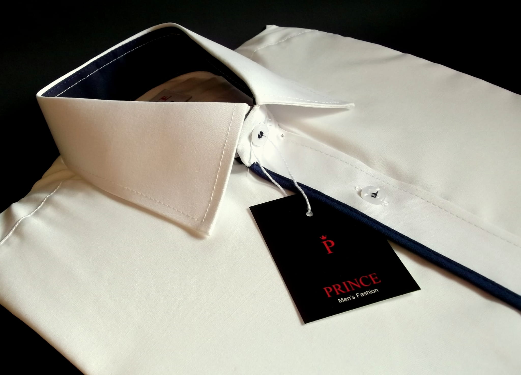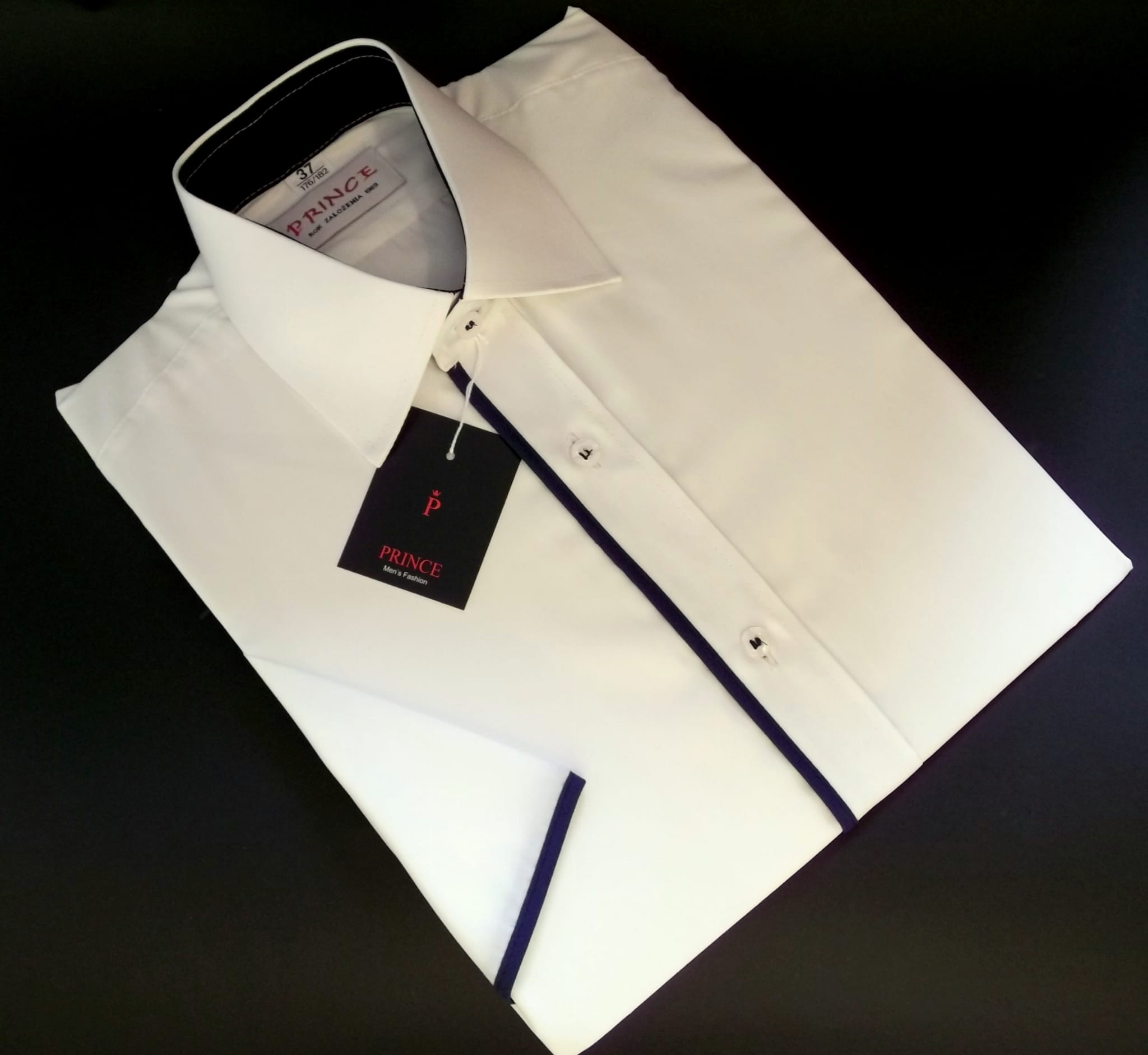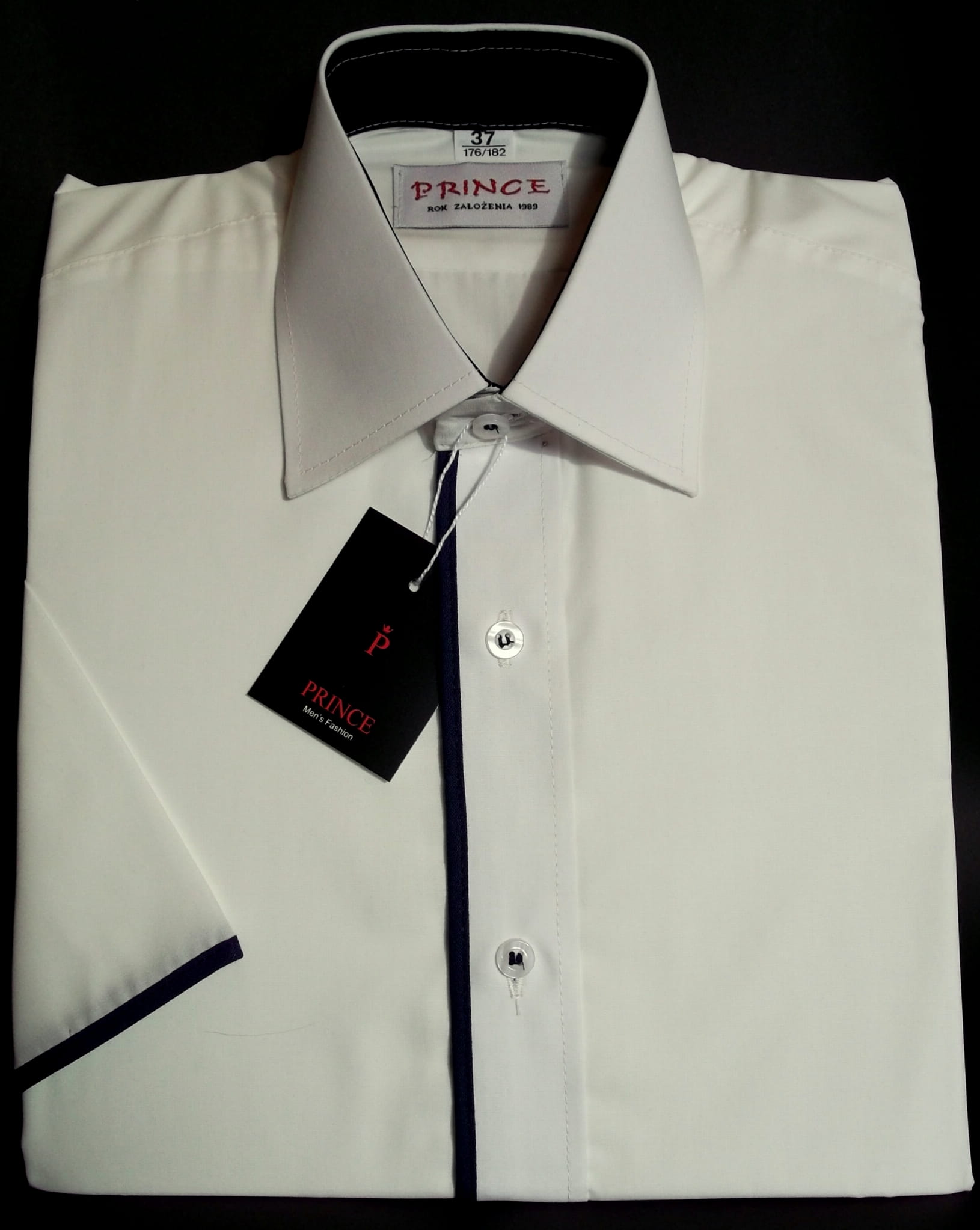 Koszula męska ecru gładka z granatowymi lamówkami.