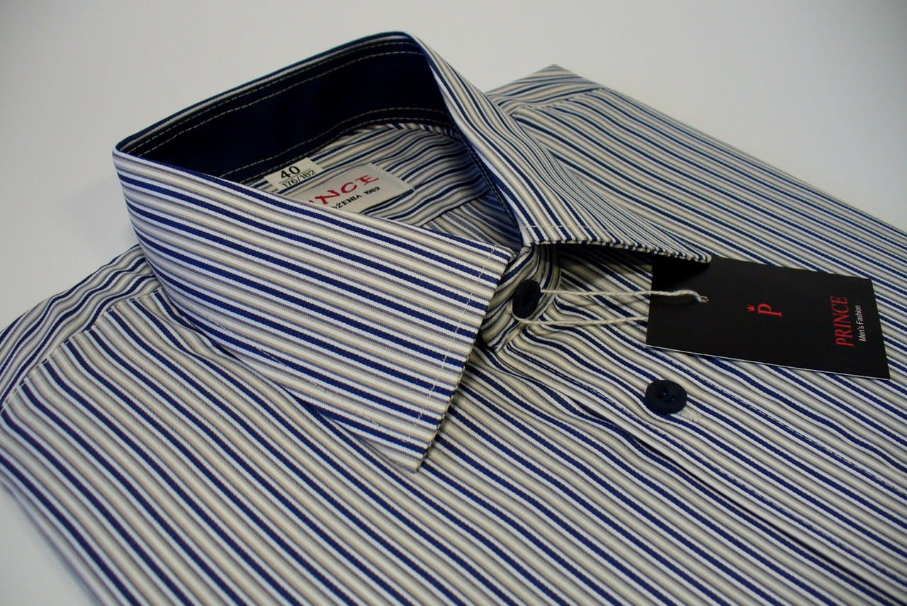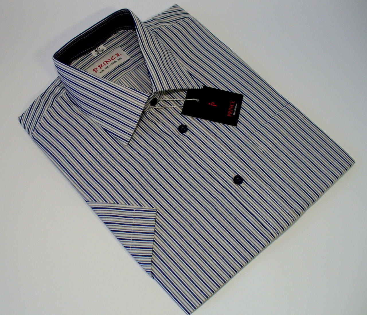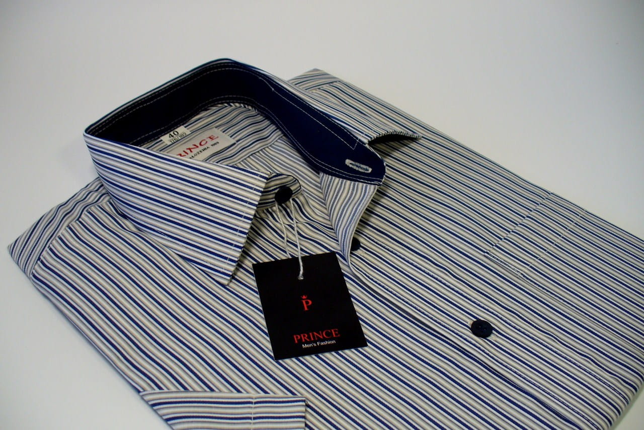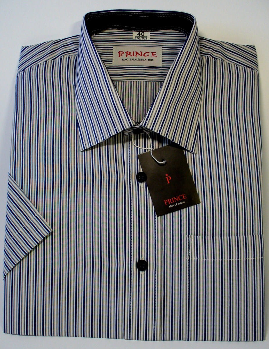 Koszula męska granatowo-kremowo-biała prążki.